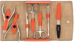 Набор состоит из 7 предметов: ножницы для ногтей, ножницы для кутикулы, кусачки для ногтей, кусачки для кутикулы, пилка, шабер, вспомогательный инструмент. Великолепный чехол из натуральной кожи подчеркнет высокий статус обладателя этого набора.Тип пилочки: металлическаяФорма пилочки: прямаяЗастежка футляра: кнопкаЦвет футляра: оранжевыйУникальные преимущества маникюрного набора АМИ:Профессиональная алмазная заточкаМатовое покрытие металла, а значит инструмент не скользит в руках.Особенная заточка Читать полностью